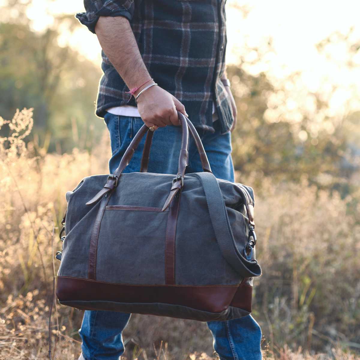 The canvas leather hybrid is the format that most directly answers the complaint that full leather bags are too heavy and that full canvas bags wear without the character of leather. In a canvas leather duffle bag, the canvas body is light, moisture-resistant, and rugged for the environments where a bag gets set on rough surfaces. The full-grain leather handles, base corners, and strap are the components that develop patina – deepening in tone and character with every carry. The result is a bag that weighs less than a full leather bag, handles rain and outdoor environments better, and still develops the personal character that makes quality leather goods worth owning for decades.